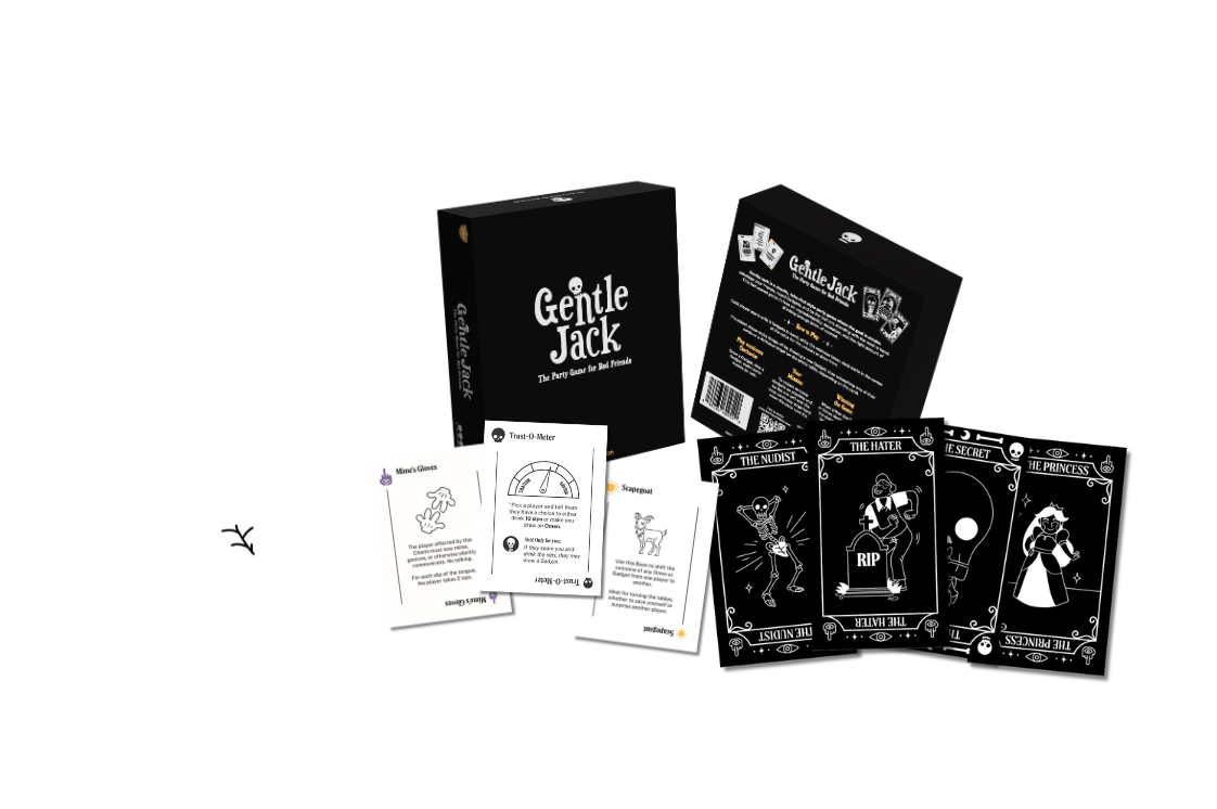 Gentle Jack is the drinking party game where luck, strategy, and absurdity collide. Players draw cards that unleash unpredictable challenges, persistent effects, and ruthless twists.With every round, the stakes rise as Omen cards create lasting consequences and Gentle Jack’s influence spreads. It’s fast, it’s brutal, and it’s the perfect mix of competition and debauchery. Whether you play to win or to devote yourself to a life of revelry, one thing is certain: no one escapes Gentle Jack unchanged.